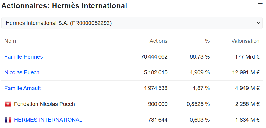 限定2025年3月12日的爱马仕主要鼓舞组成,皮埃什那时仍被列为最大个东说念主鼓舞/图源:Zonebourse