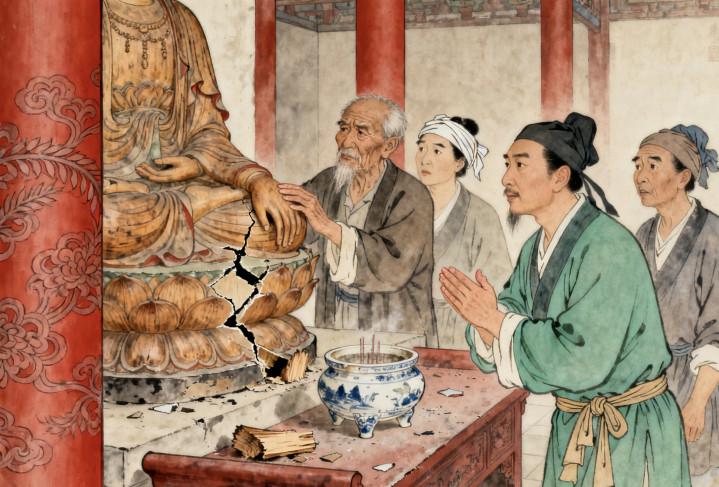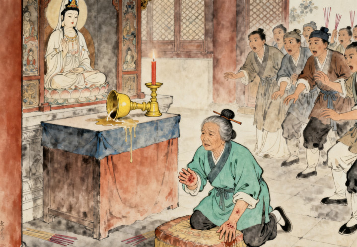 先是寺里的小头陀说,夜里听见佛像在 “太息”;自后,镇上的小孩开动哭闹,说 “看到不雅音的眼睛在流血”;更邪门的是,有个老夫妇给佛像上香时,刚跪下,供桌上的烛台就倒了,蜡油溅在她手上,起了一串水泡。